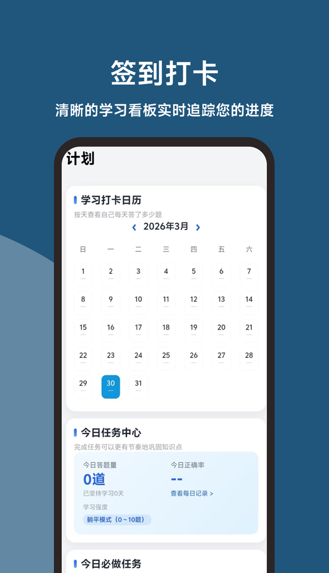 实时展示答题量与正确率,支持自定义学习强度,规划每日学习目标,告别盲目备考,让复习更有章法。