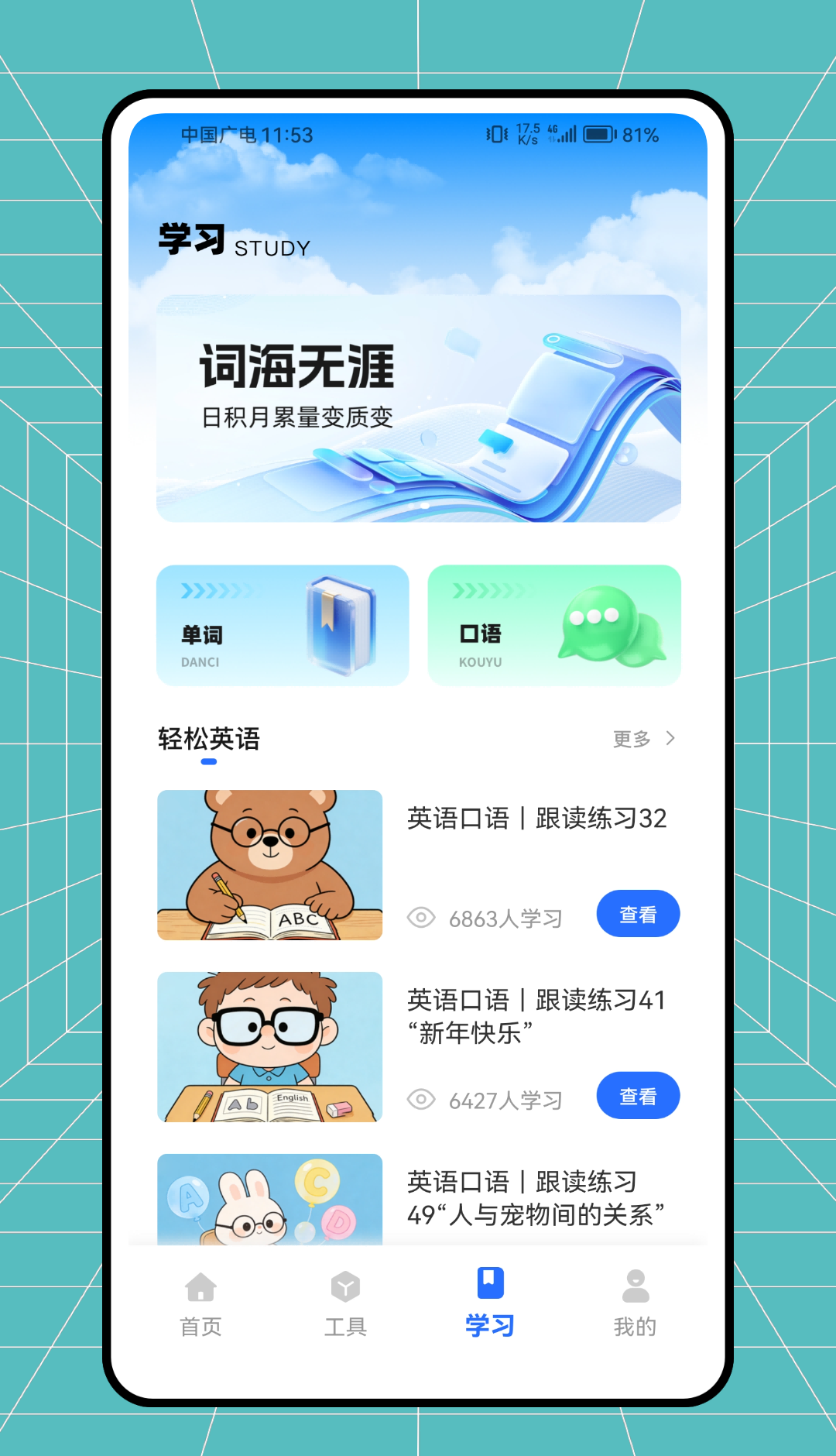 4、英语学习模块丰富单词记忆和口语练习无尽的单词海洋有助于提高语言能力。