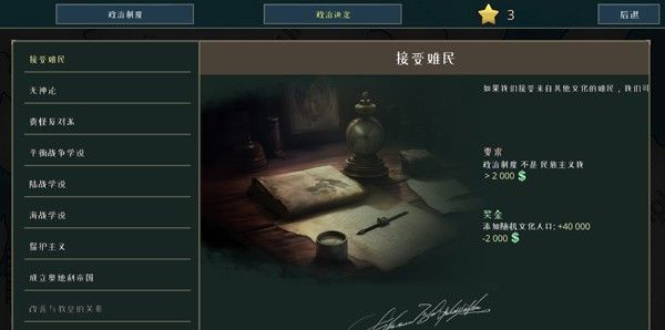 选择六大政治制度(如神权统治、共产主义),颁布政策影响国家发展。