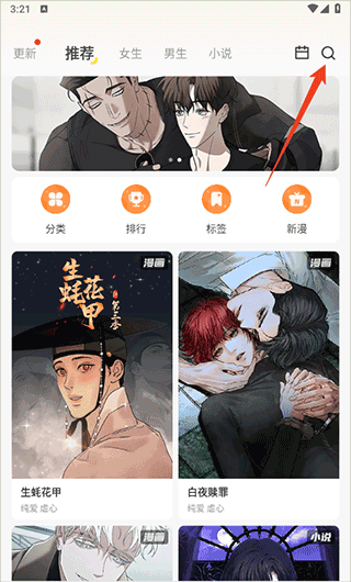 1、进入画涯首页后点击右上角的搜索按钮。