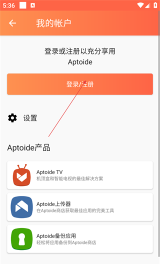 2、点击右上角的账户图标,进入“我的账户”页面,可以通过“登录/注册”进入账户流程,查看Aptoide TV等衍生产品。