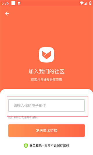 4、输入电子邮件后点击“发送魔术链接”,通过邮件链接完成注册,Aptoide采用安全登录机制,不会保存用户密码。