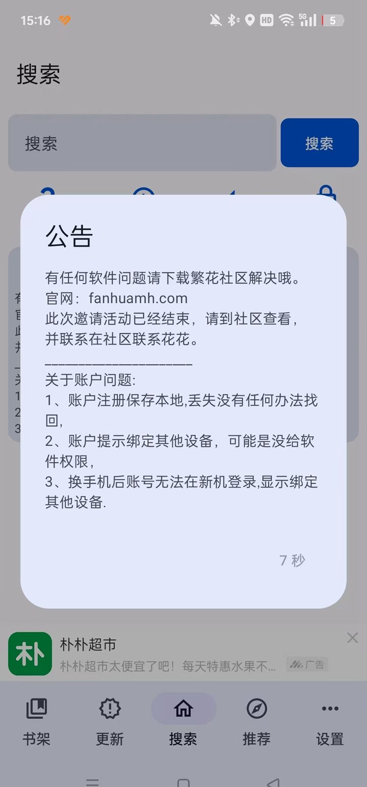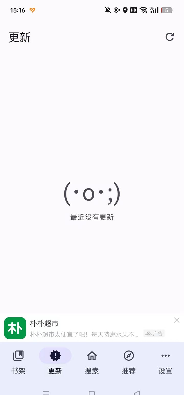2、阅读完成后,可以看到【书架】、【更新】、【搜索】等栏目中并没有像其他漫画软件那样,展示出详细的分类。