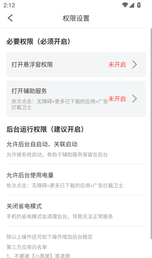 2、在权限管理页面,开启必要的权限,保证该软件的功能能够正常使用。