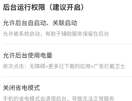 3、为保证软件的正常运行,授权部分权限,比如自启动、使用后台电量、关闭省电模式、在任务切换界面中锁定。