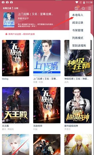 2、点击书架板块,找到右上角的菜单,点击本地导入;