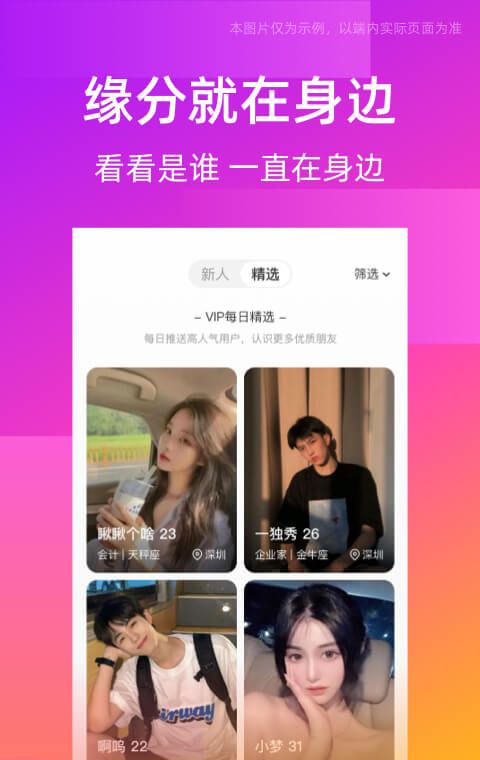 同城交友圈app官方版下载是一款非常优质实用的手机在线交友聊天软件,在这款软件中用户需要完善自身的一些资料,协商自己的兴趣爱好等一些自身特长,这样软件才能为用户精准的推送同城中性格相似的异性朋友,实现轻松的线上交友,还可以线下约会见面,其实缘分就在我们身边,快来下载这款软件为我们寻找缘分吧。
