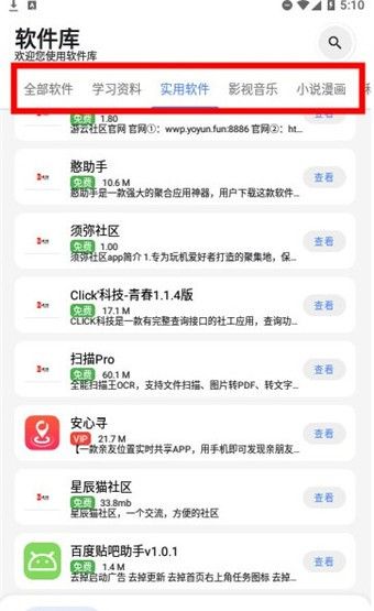 1、点击首页进入到车库里面去以后,可以选择全部软件就能够看到所有的软件,下拉往下看就行,还有分类,分成了学习资料、实用软件、影视音乐、漫画小说这些类型的,比如说使用软件里面的须弥社区、click科技-青春1.4版、扫描pro、星辰猫社区等等!