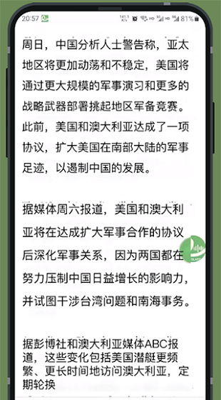 翻译屏幕显示的外语文字,有悬浮按键,按下按键之后,会自动将屏幕中的外语翻译成对应文字。拖动屏幕随即恢复,按需翻译。