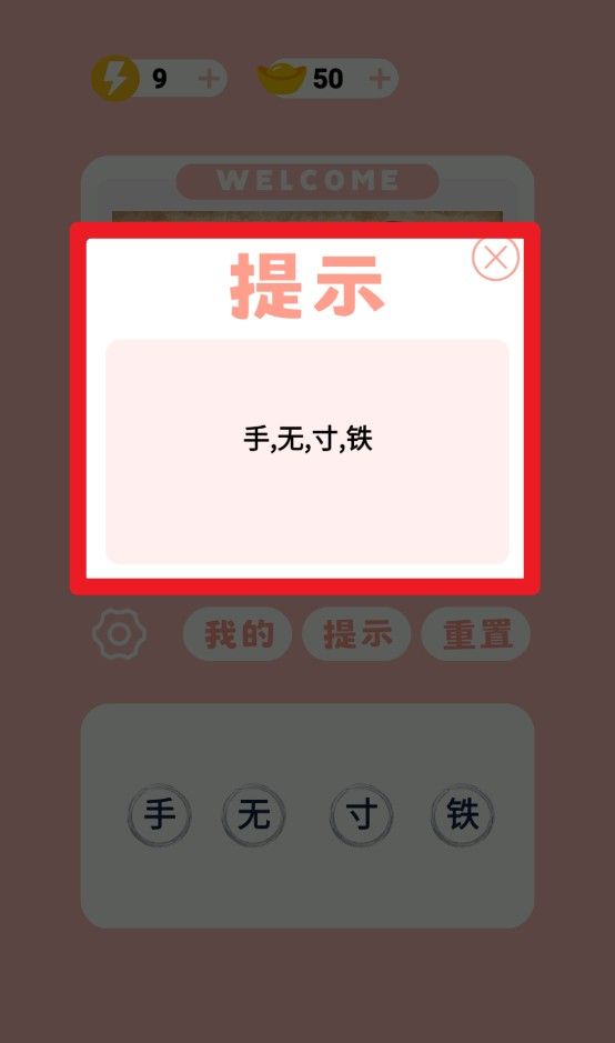 3、点击“提示”按钮后会弹出关键字,帮助用户快速猜出正确答案。