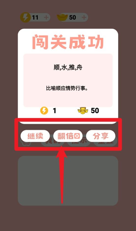 2、通关界面显示成语释义,用户可选择继续下一关、翻倍奖励或分享内容。