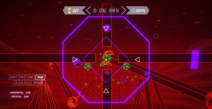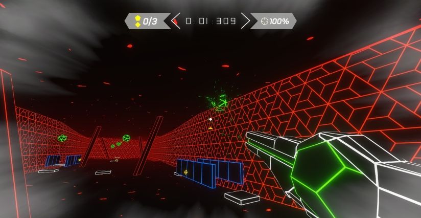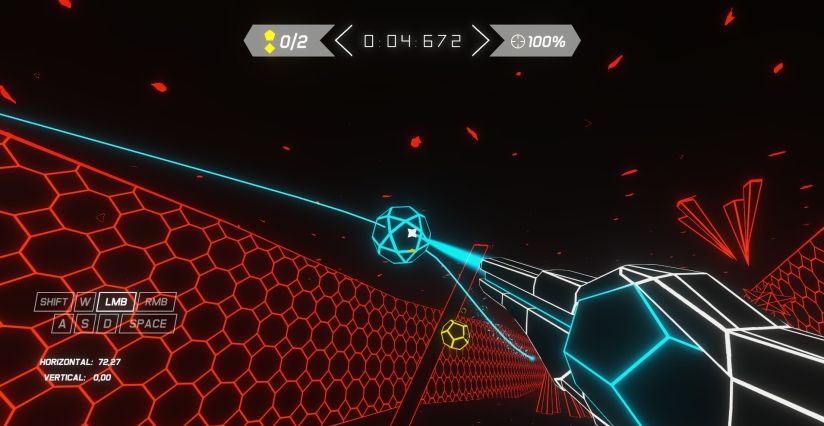 核心玩法是通过射击场景中的彩色多面体来产生反作用力,推动角色在关卡中前进。玩家需要精确瞄准不同位置的多面体来控制移动方向和速度,同时避免超速行驶。游戏设有全球排行榜系统,玩家可以挑战自己的最佳成绩并与全球玩家竞争排名。