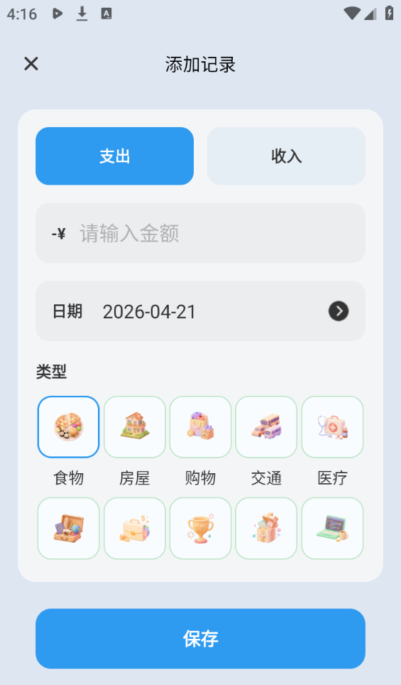3、选择完您要记得是收入还是支出后选择类型并记下金额后点击保存。